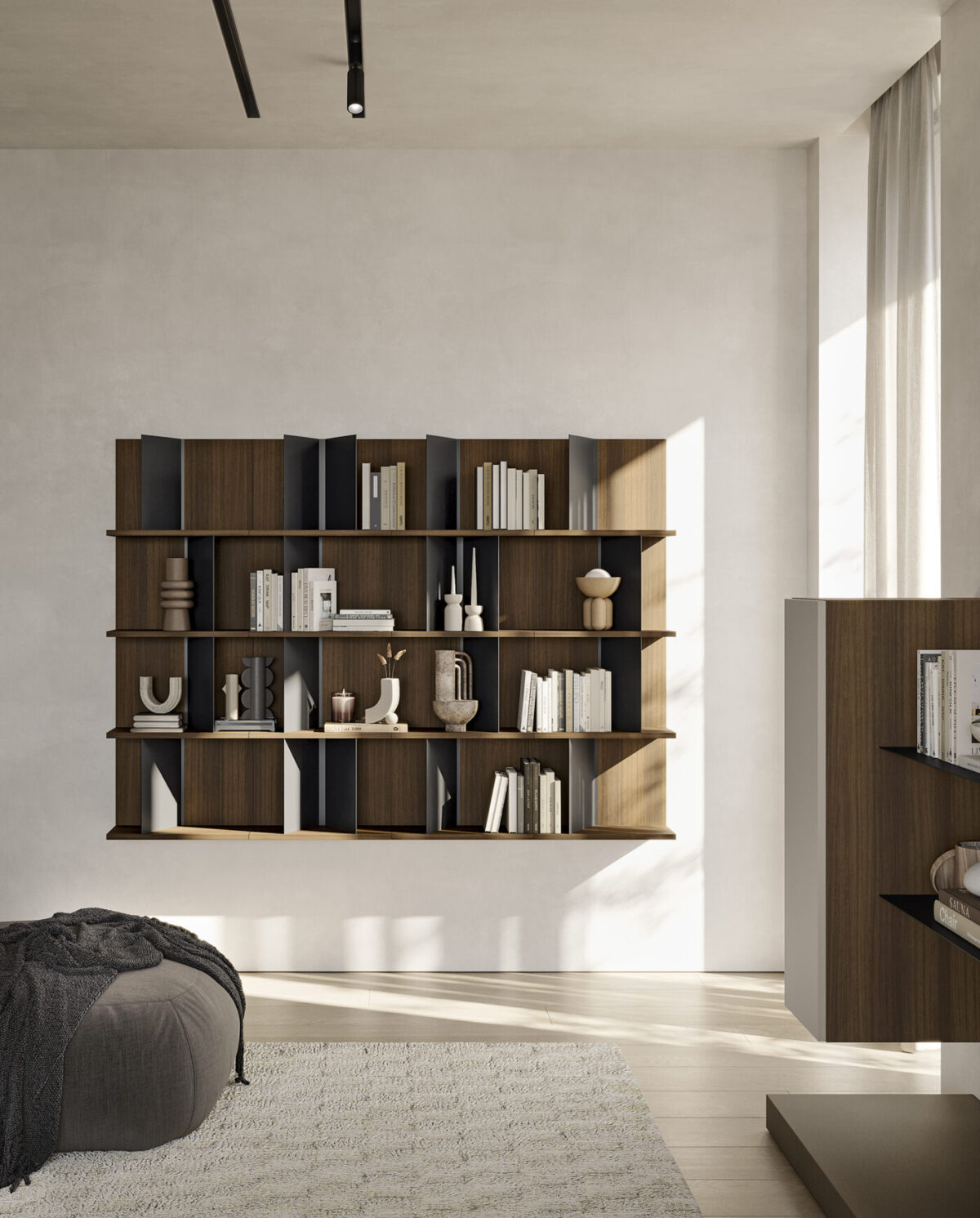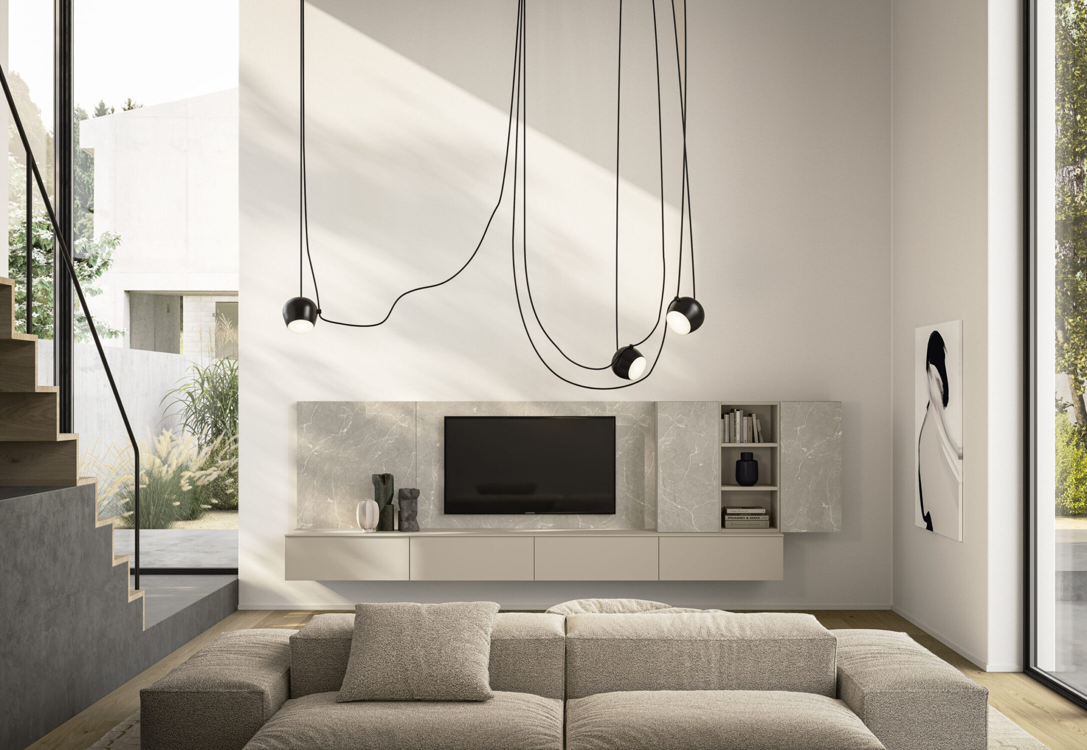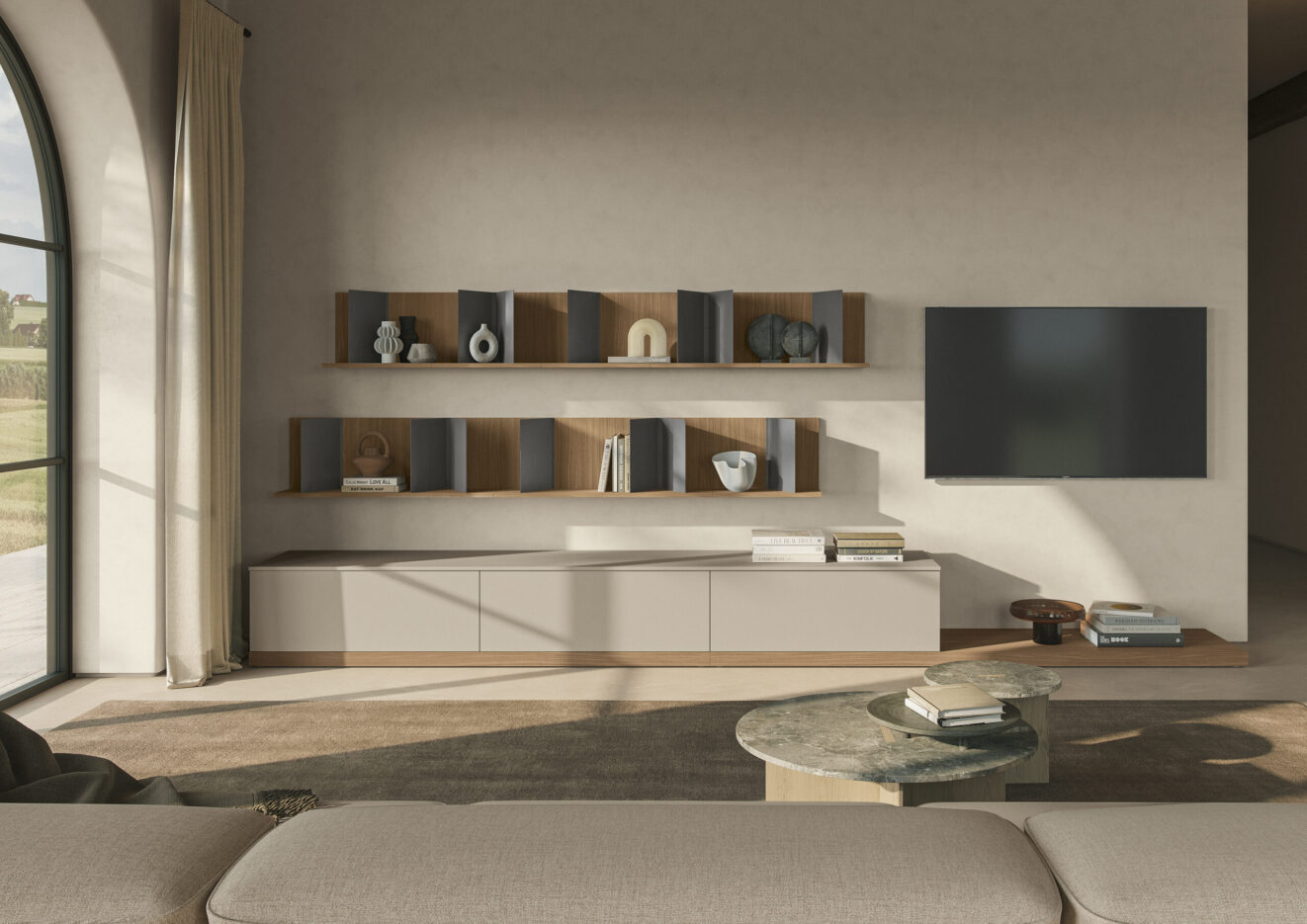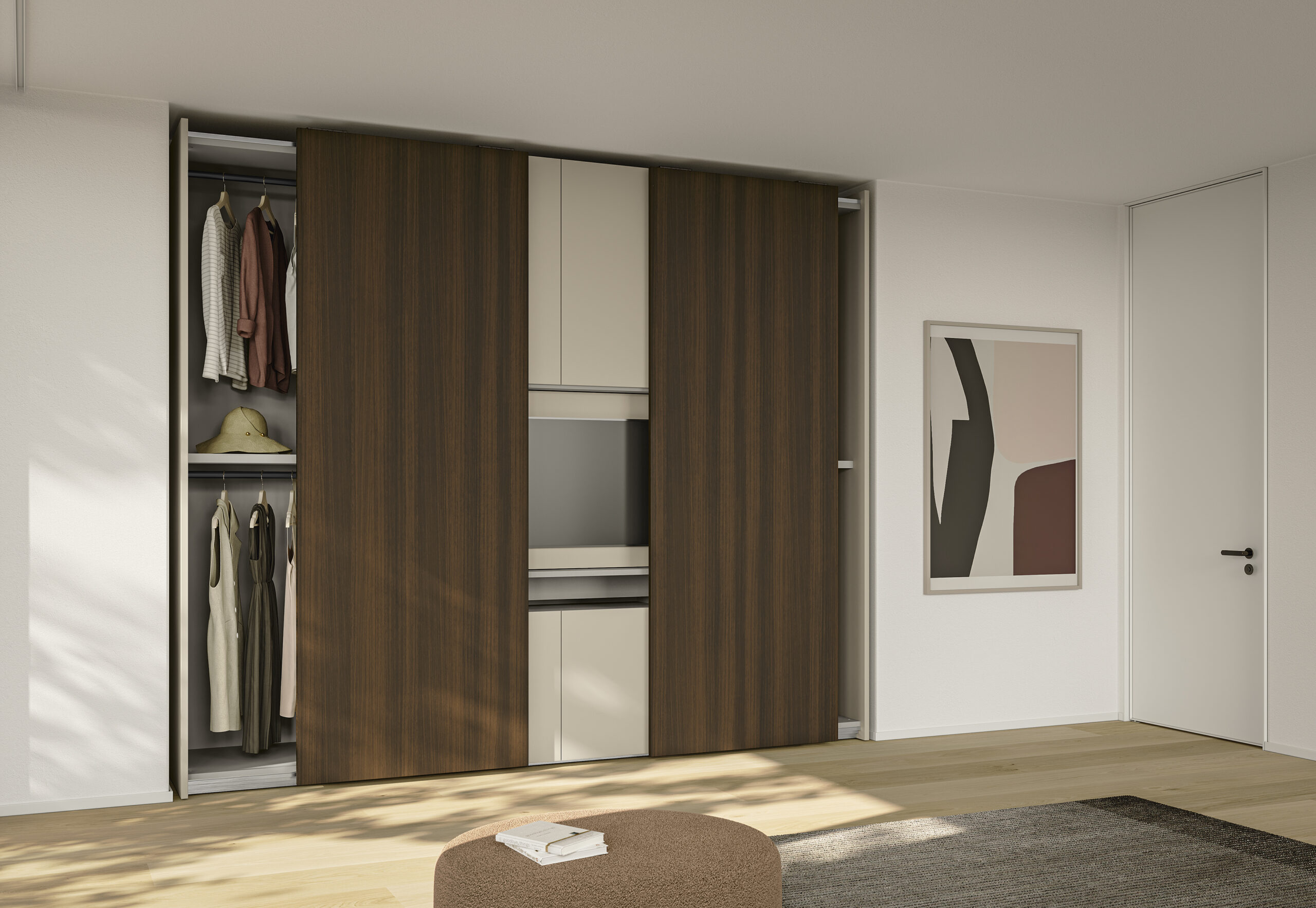 Reinventare, dividere, moltiplicare. È il mantra dell’Appartamento Duplex, pensato per famiglie in evoluzione, in cerca di arredamento duraturo e spazi che crescano con loro. Il protagonista è l’armadio con vano TV Concreta, una vera innovazione per chi desidera integrare tecnologia e ordine nella zona notte.