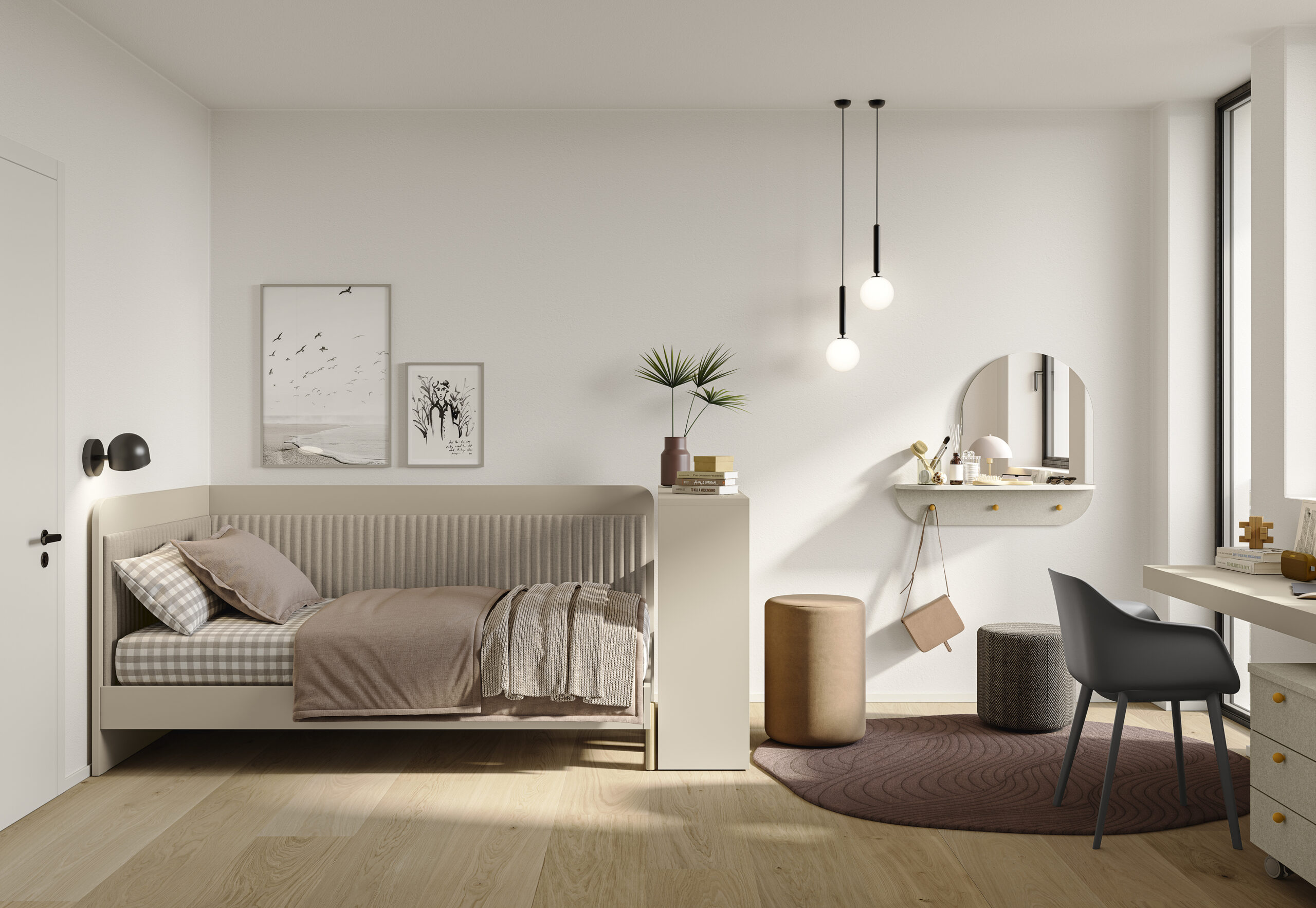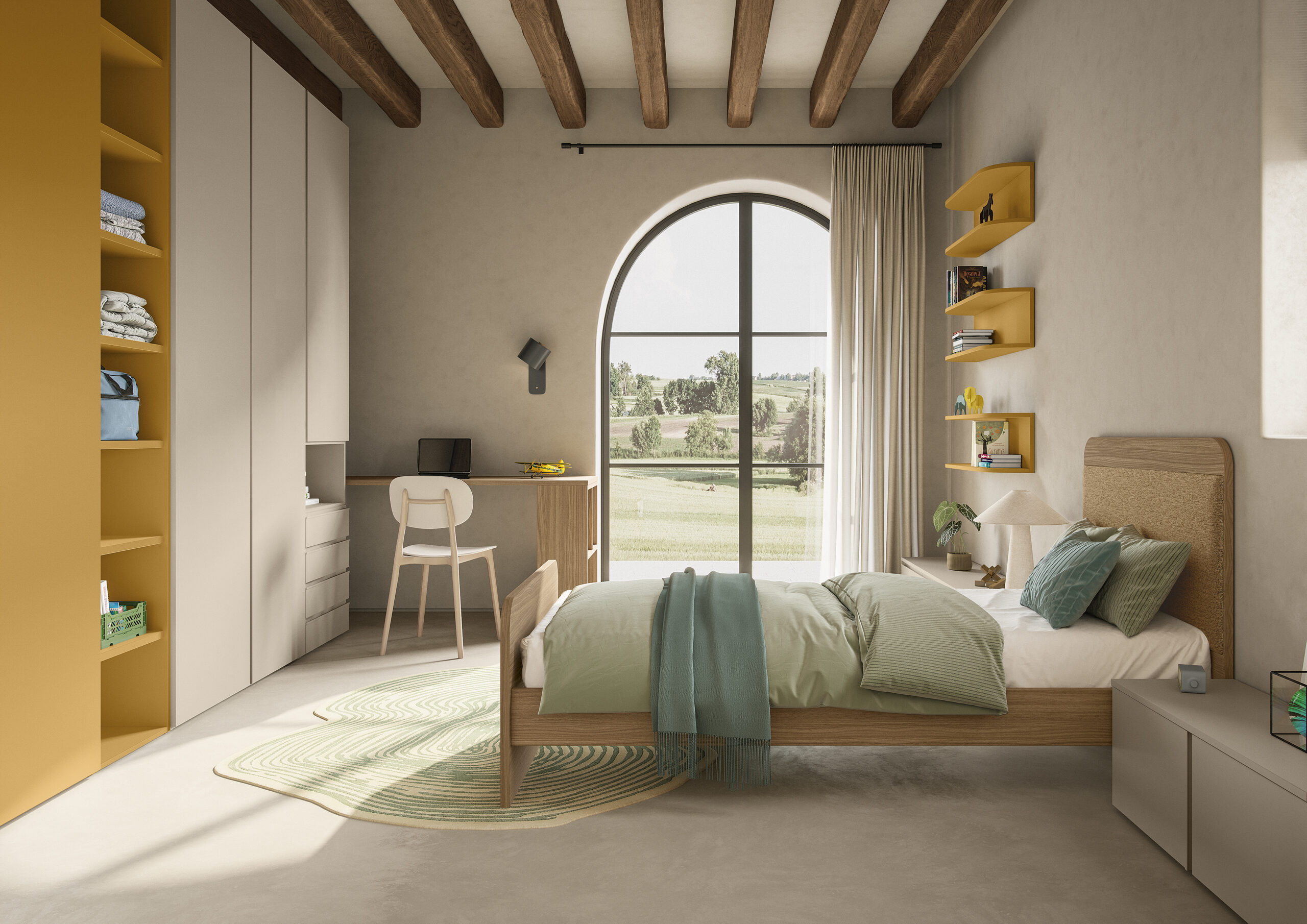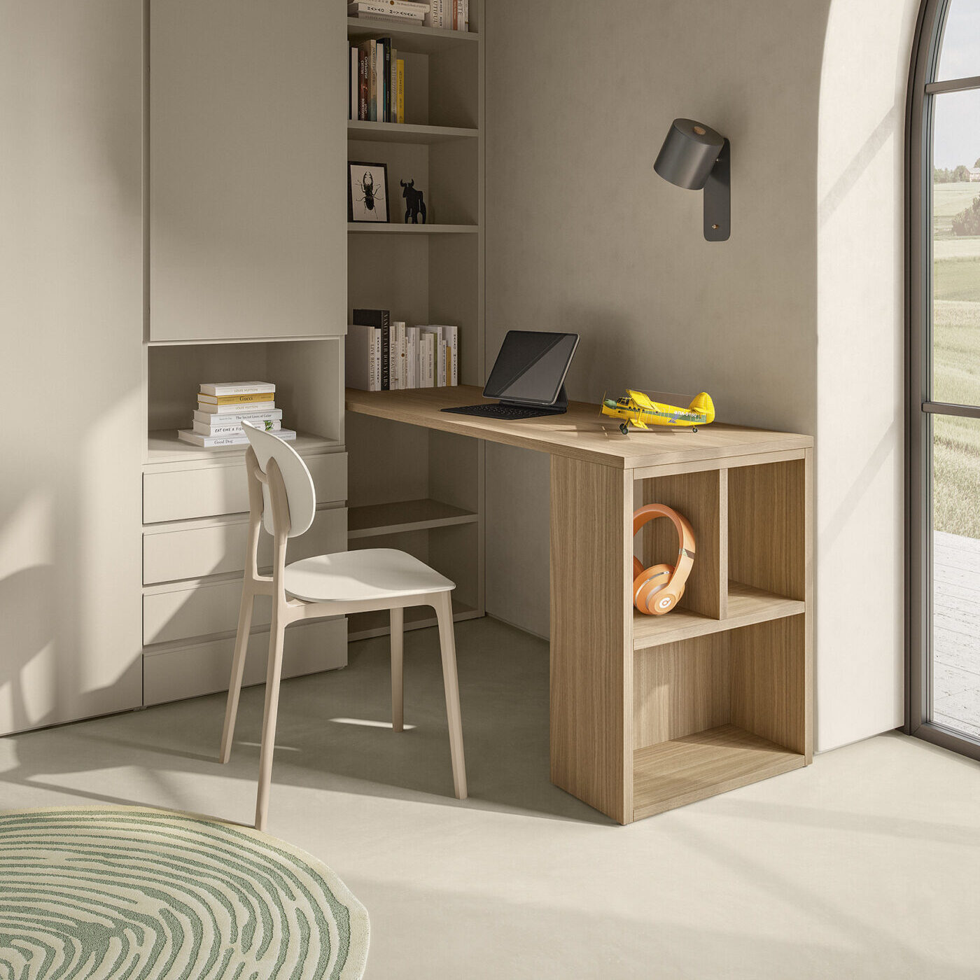 Il sistema Nodo, con la sua libreria terminale e lo scrittoio integrato, è pensato per chi ha bisogno di soluzioni salvaspazio eleganti, ideali per camerette o zone studio compatte ma curate nei dettagli.