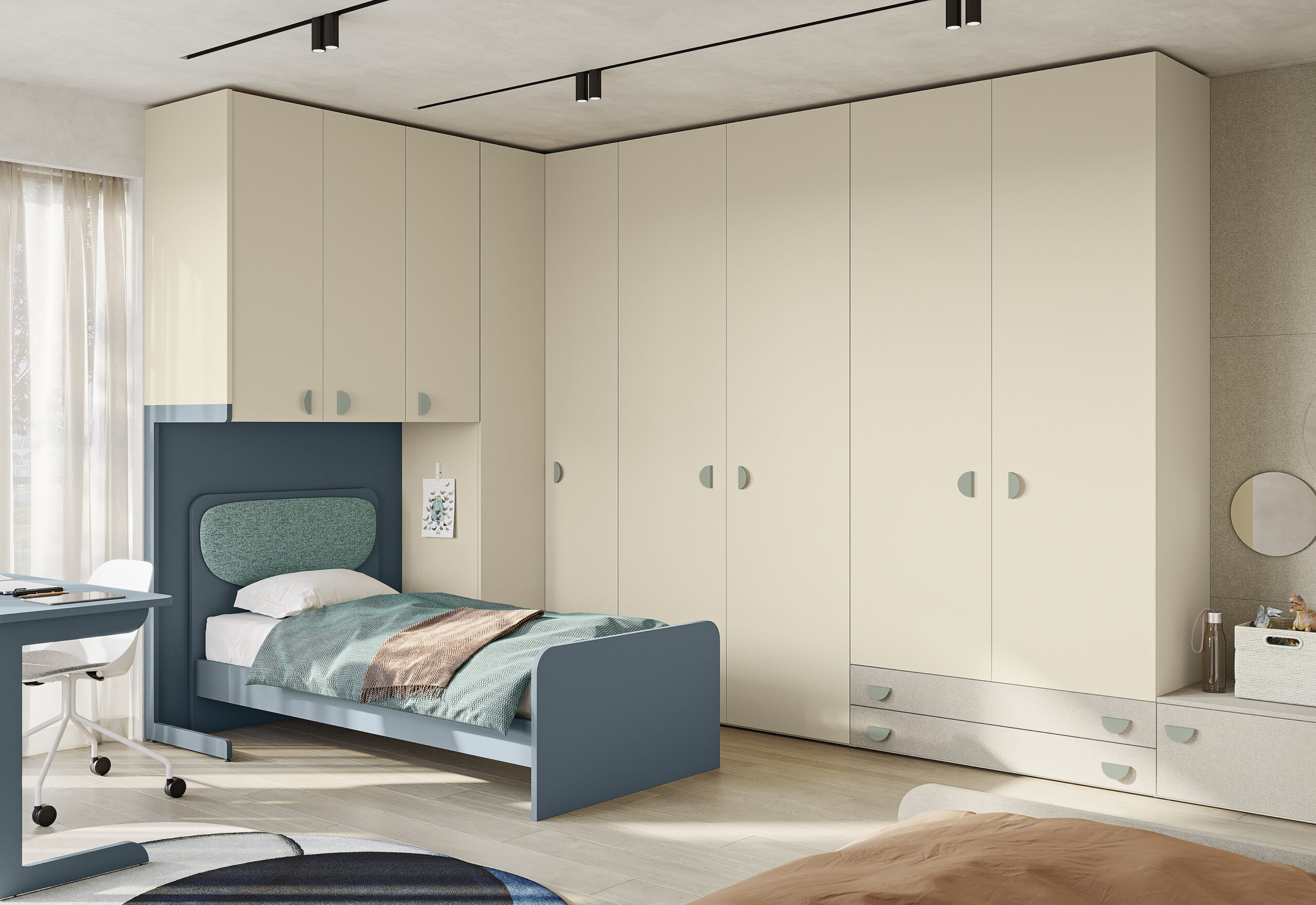 Il gioco di boiserie, librerie e pensili crea un ambiente fluido e ricco di connessioni visive, in cui ogni elemento ha una funzione ben precisa. Le camerette sono ideate per crescere insieme ai bambini, con sistemi componibili e camerette salvaspazio.